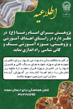 گفتنی است، در قالب طرح «واقفین پژوهش» این مجموعه، دانش آموزان میتوانند سنگها و کانیهای خود را که با معیارهای تعریف شده، مطابقت داشته باشند، جهت تکمیل منابع موزهای، اهدا کنند که به نام خودشان به نمایش گذاشته خواهد شد.
