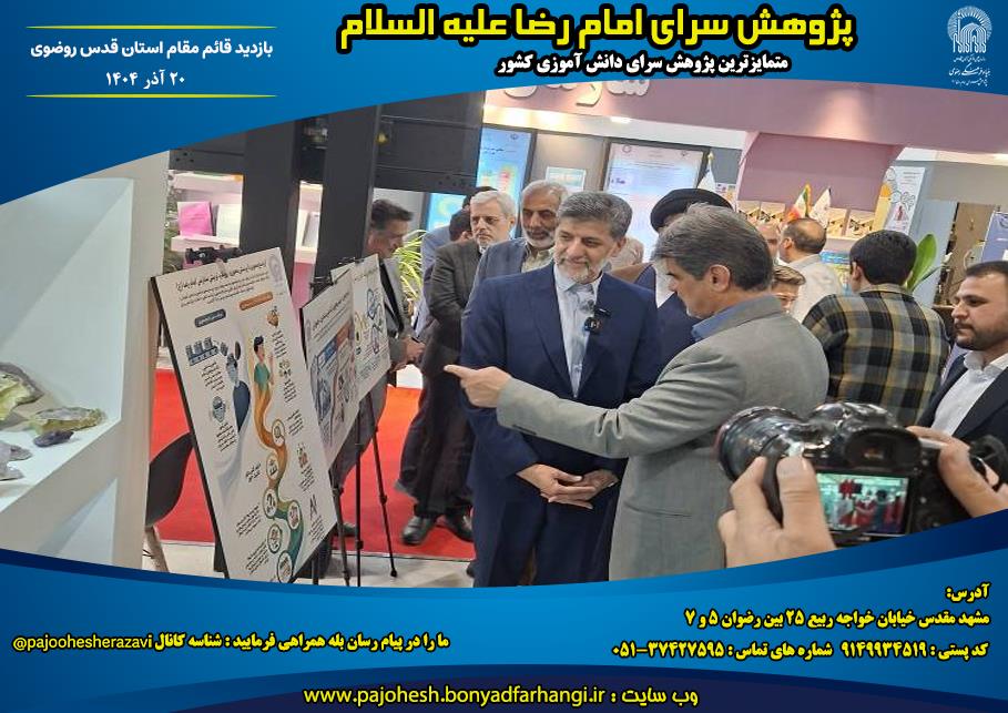 حضور قائم مقام محترم آستان قدس رضوی در غرفه بنیاد فرهنگی رضوی و دریافت توضیحات از زبان دانش آموزان غرفه دار در نمایشگاه پژوهش و فناوری استان خراسان رضوی